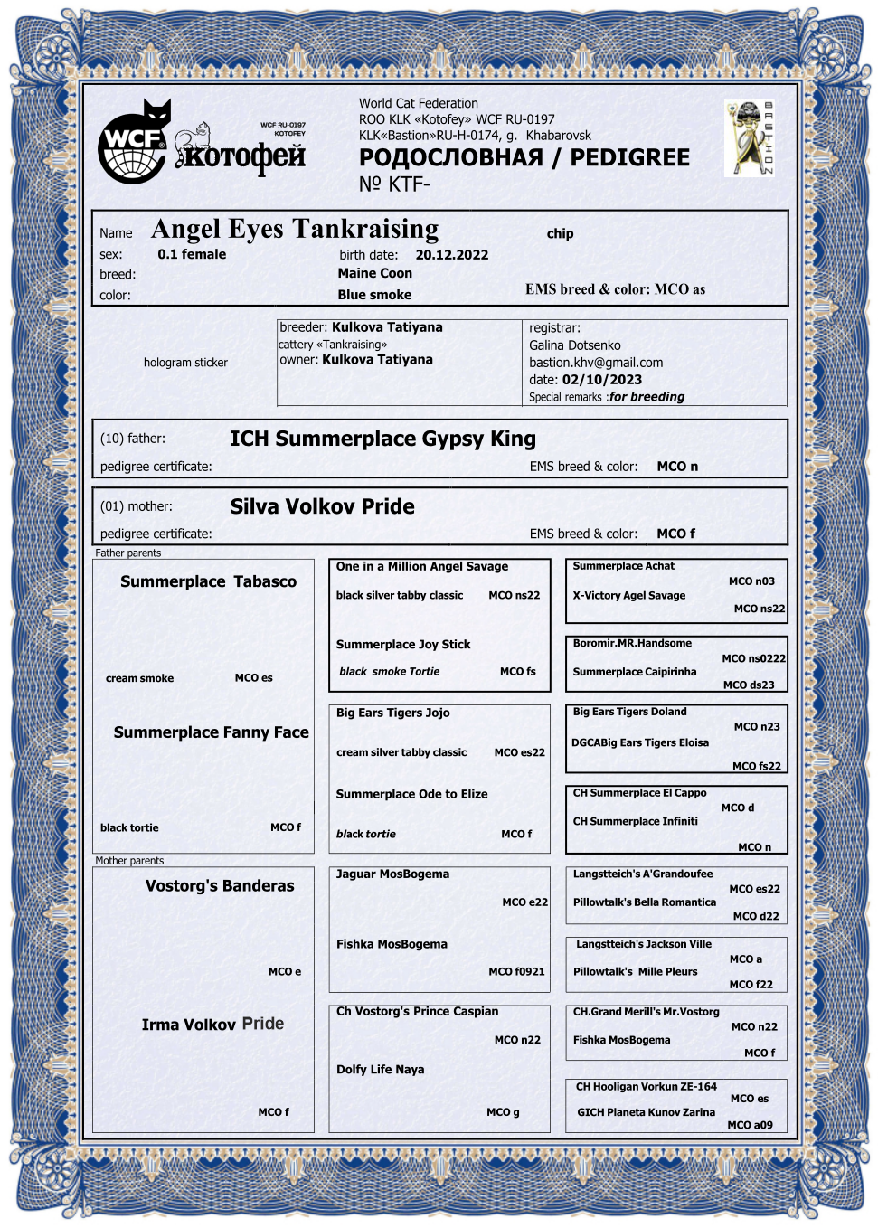 Дата рождения - 20.12.2022 Окрас - голубой дым Код окраса- MCO as Отец - Summerplace Gypsy King MCO n Мать - Silva Volkov Pride MCO fs22 Заводчик - Кулькова Татьяна Владелец - Кулькова Татьяна HCM, SMA, PKdef -N/N