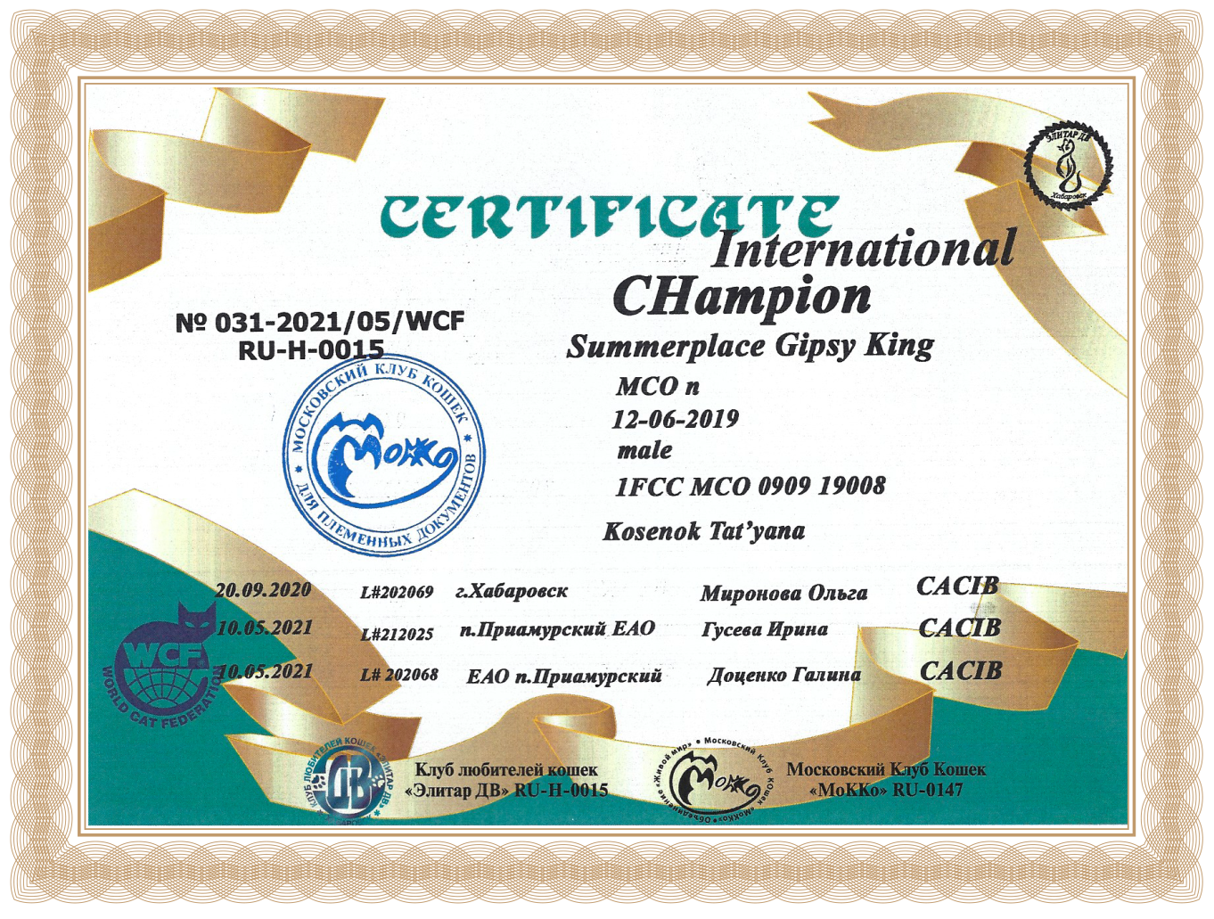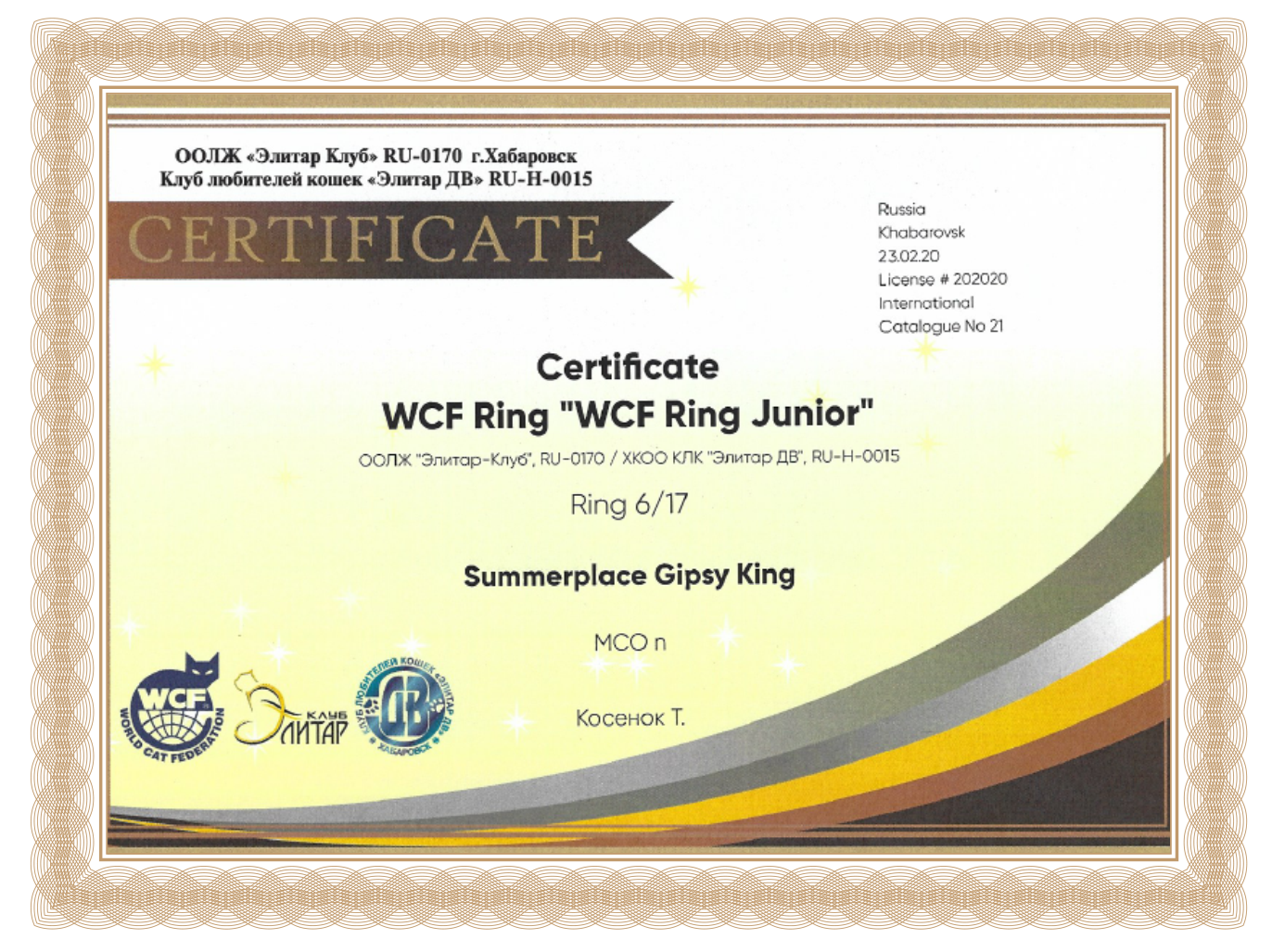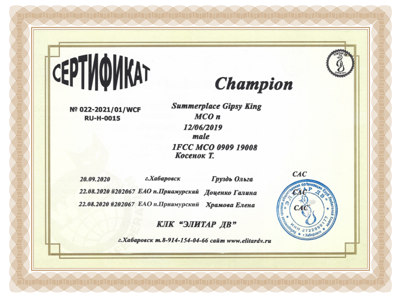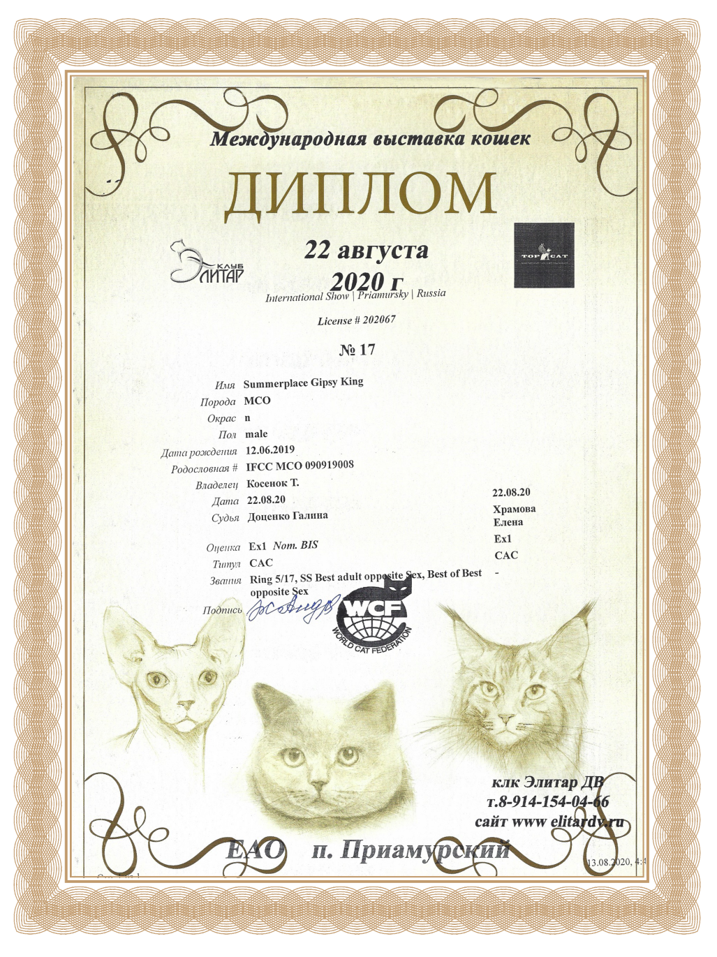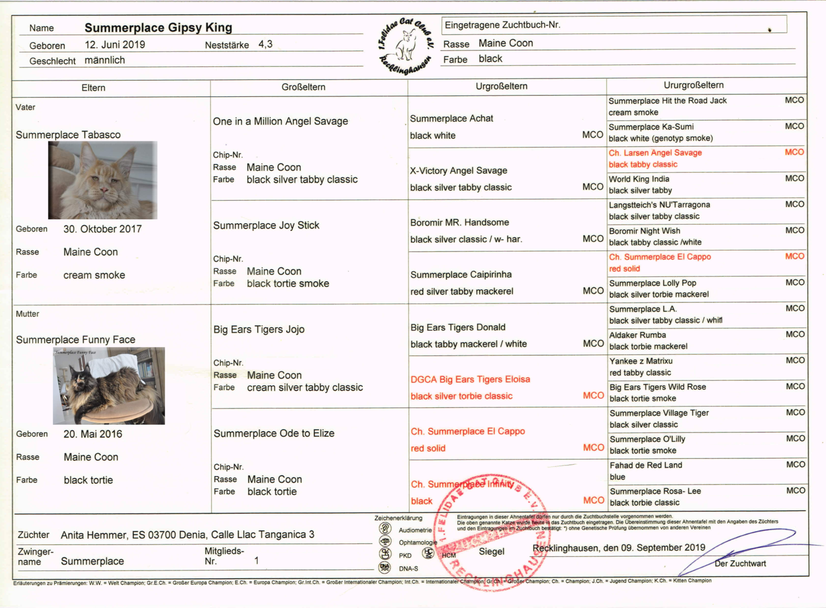 Пол - кот Дата рождения -12.06.2019 Окрас - черный солид Код окраса - MCO n Отец - Summerplace Tabasco MCO es Мать - Summerplace Funny Face MCO f Заводчик - Anita Hemmer Владелец - Косенок Татьяна HCM, SMA, PKdef -N/N