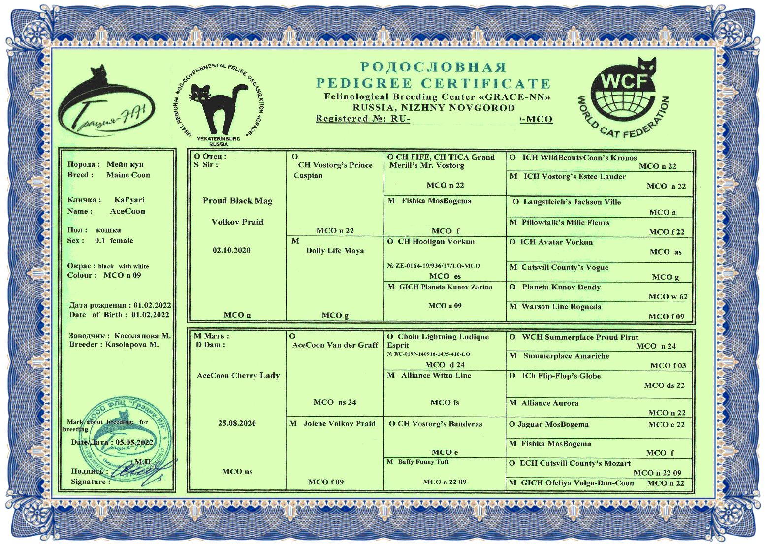 Дата рождения - 01.02.2022 Окрас - черная с белым Код окраса- MCO n09 Отец - Proud Black Mag Мать - AceCoon Cherry Lady Заводчик - Косолапова М. Владелец - Косенок Татьяна HCM, SMA, PKdef -N/N