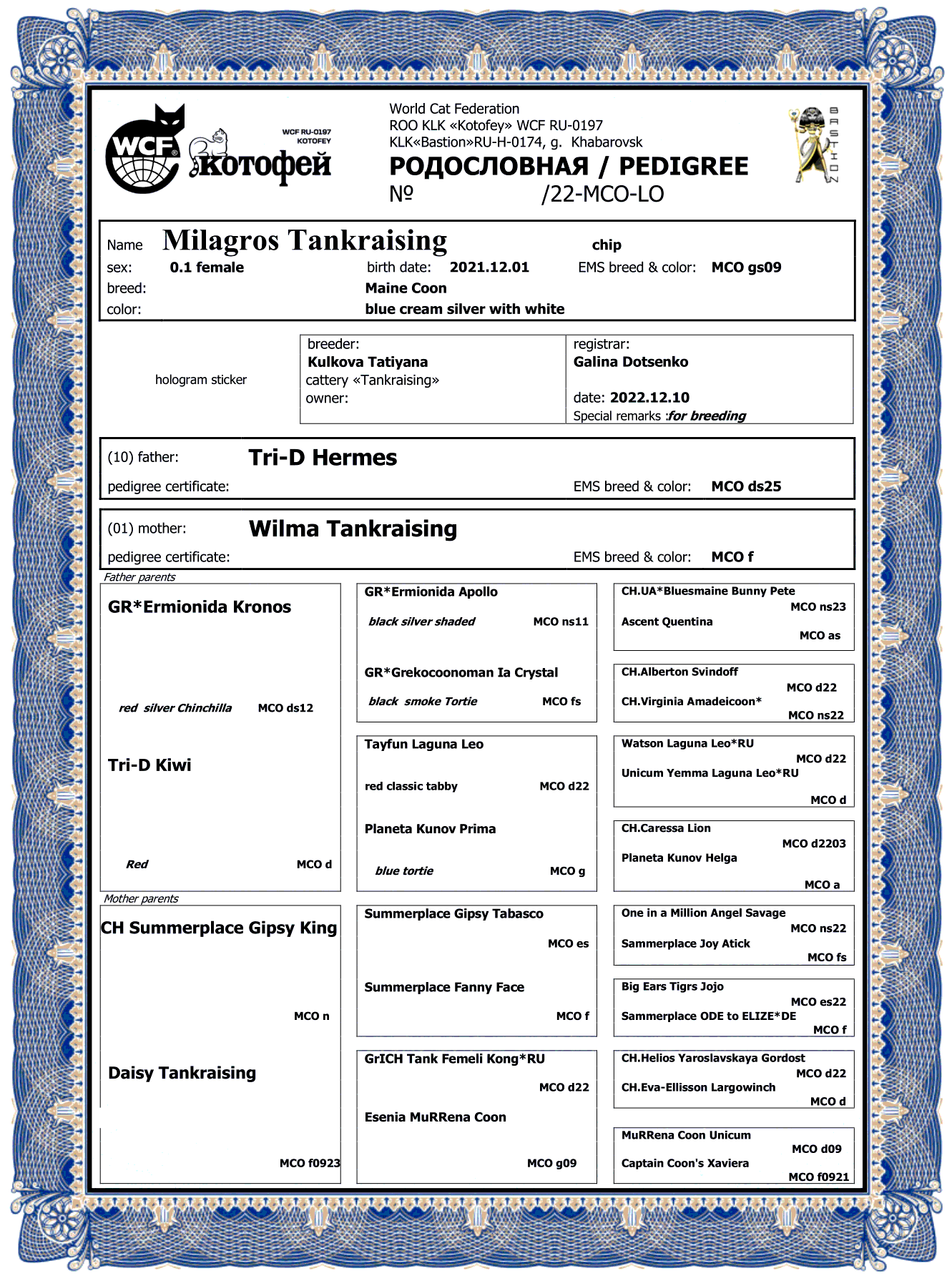 Дата рождения - 01.12.2021 Окрас - голубо-кремовая черепашка на серебре с белым Код окраса - MCO gs09 Отец - Tri-D Hermes MCO ds25 Мать - Wilma Tankraising MCO f Заводчик - Кулькова Татьяна Владелец - Кулькова Татьяна HCM, SMA, PKdef -N/N