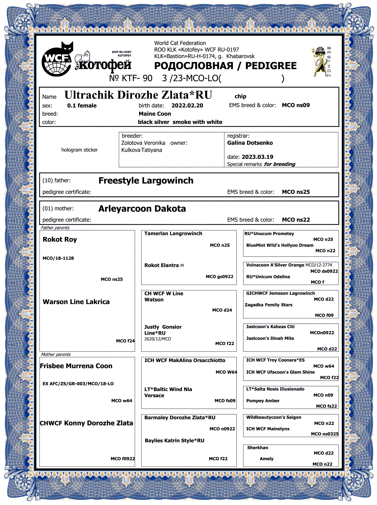 Дата рождения - 20.02.2022 Окрас - Черный дым с белым Код окраса- MCO ns09 Отец - Freestyle Largowinch Мать - Arleyarcoon Dakota Заводчик - Золотова Вероника Владелец - Косенок Татьяна HCM, SMA, PKdef -N/N