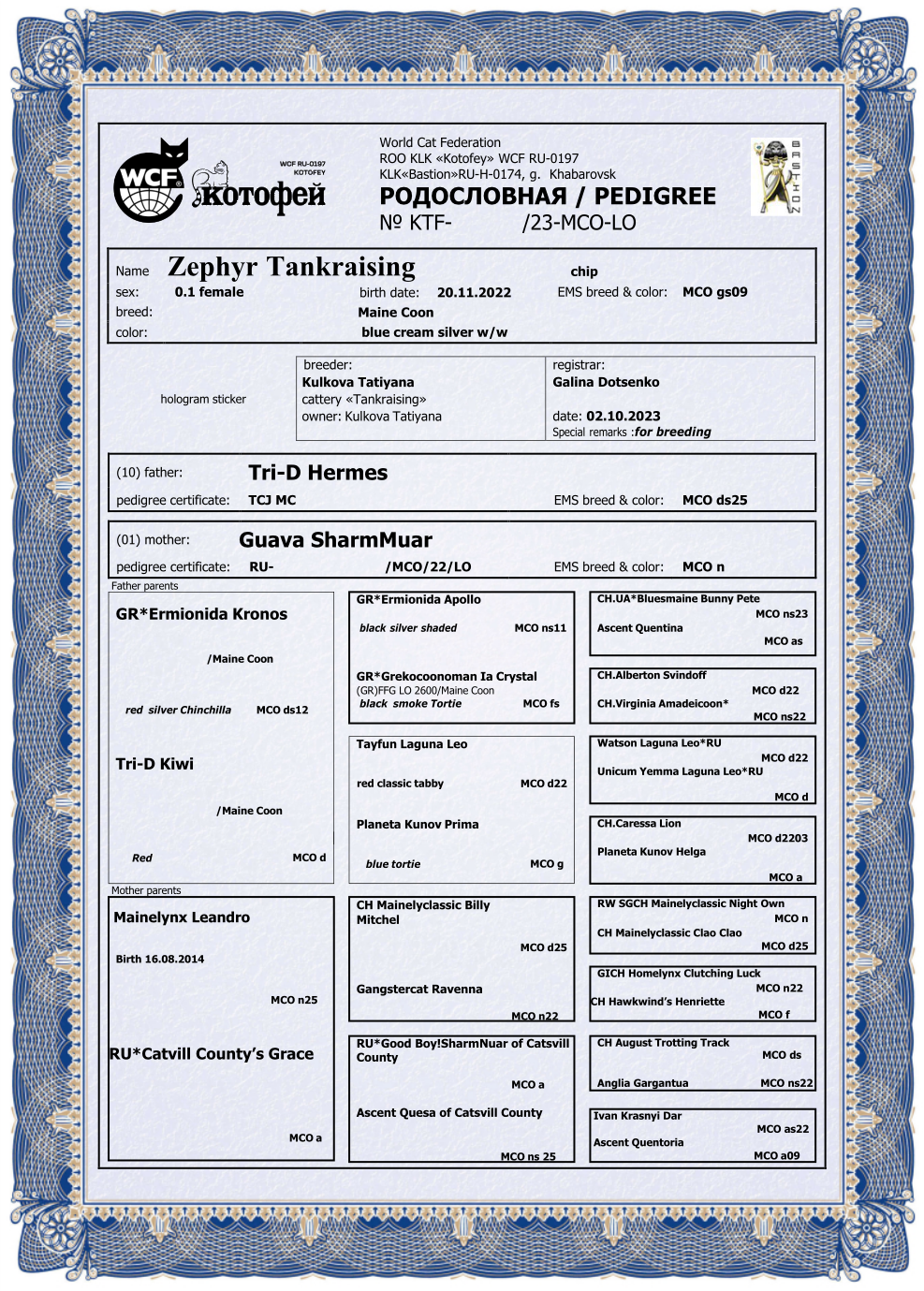 Дата рождения - 20.11.2022 Окрас - Голубо кремовая черепашка Код окраса - MCO gs09 Отец - Tri-D Hermes, color ds25 Мать - Guava SharmMuar, color m Заводчик - Кулькова Татьяна Владелец - Кулькова Татьяна HCM, SMA, PKdef -N/N